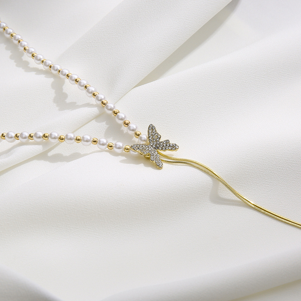 Ins Stylish Pearl Butterfly Necklace with Fresh and Sweet Style, Material: Copper, Processing Craft: Butterfly Knot, Length: 51cm-80cm