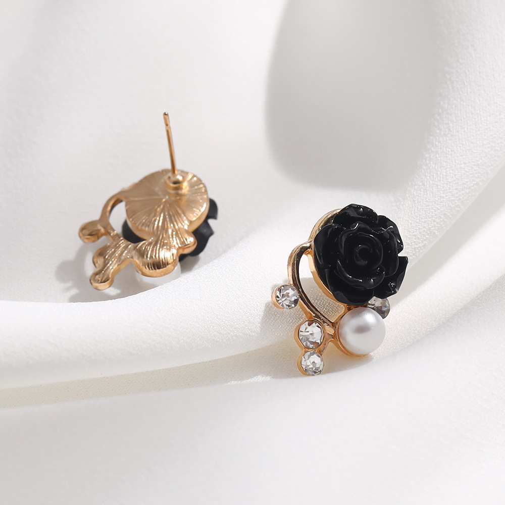 Fashionable Earrings with Black Rose Inlaid with Diamonds and Pearls