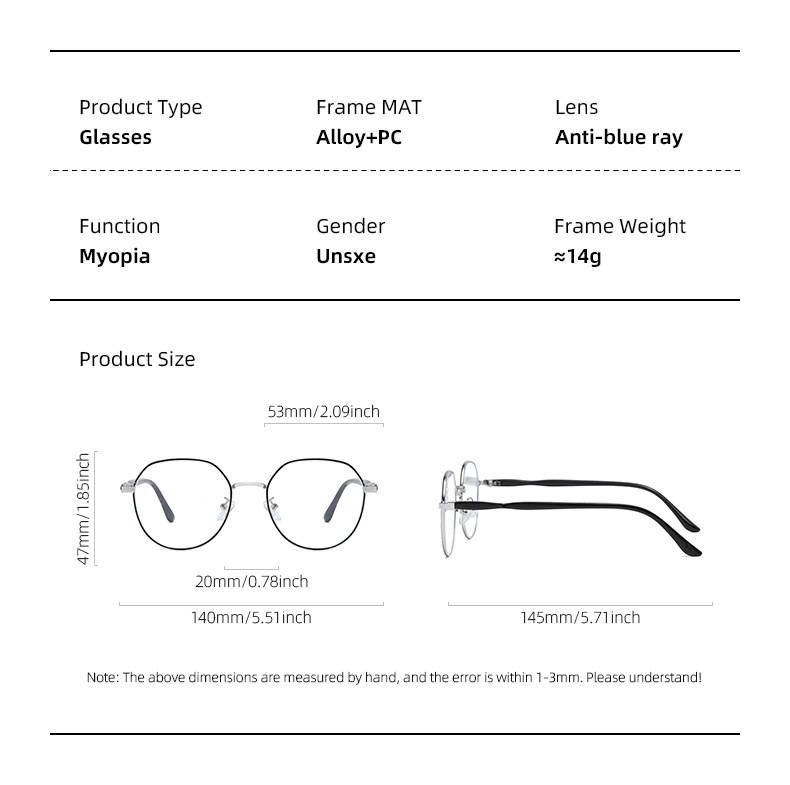 0955 Metal Frame Prescription Glasses for Adults, Anti-glare, Stylish, Durable and Suitable for Square Face