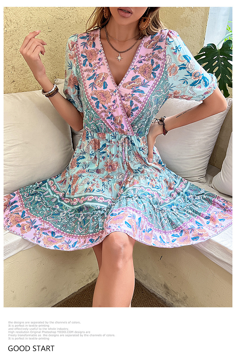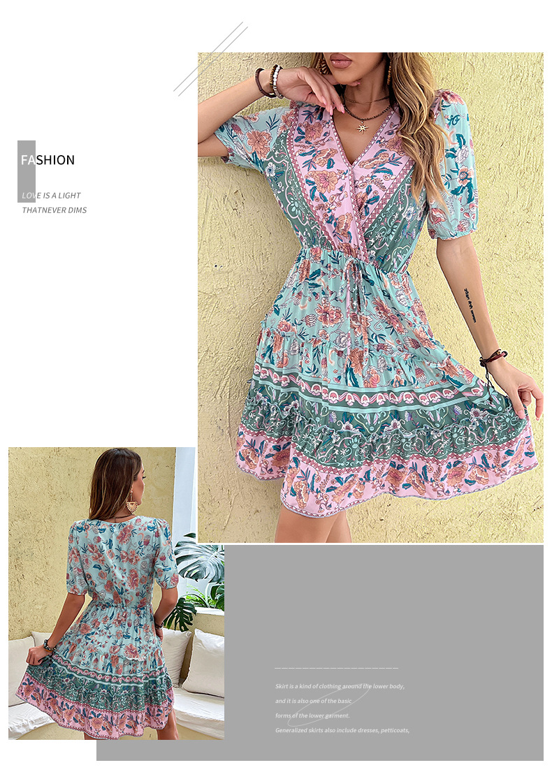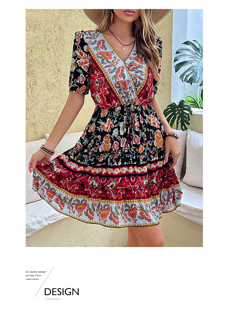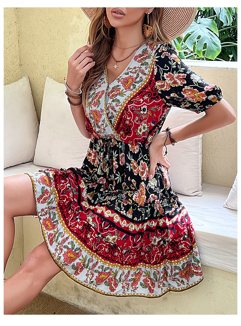 Retro Floral Print Dress with V-Neck and High Waist, 95% Cotton Fabric