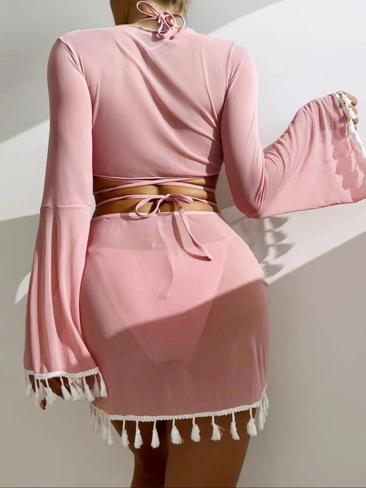 New Women Swimsuit Bikini Pure Color Tassel Net Yarn Shawl Dress Short Skirt Four-piece Swimsuit