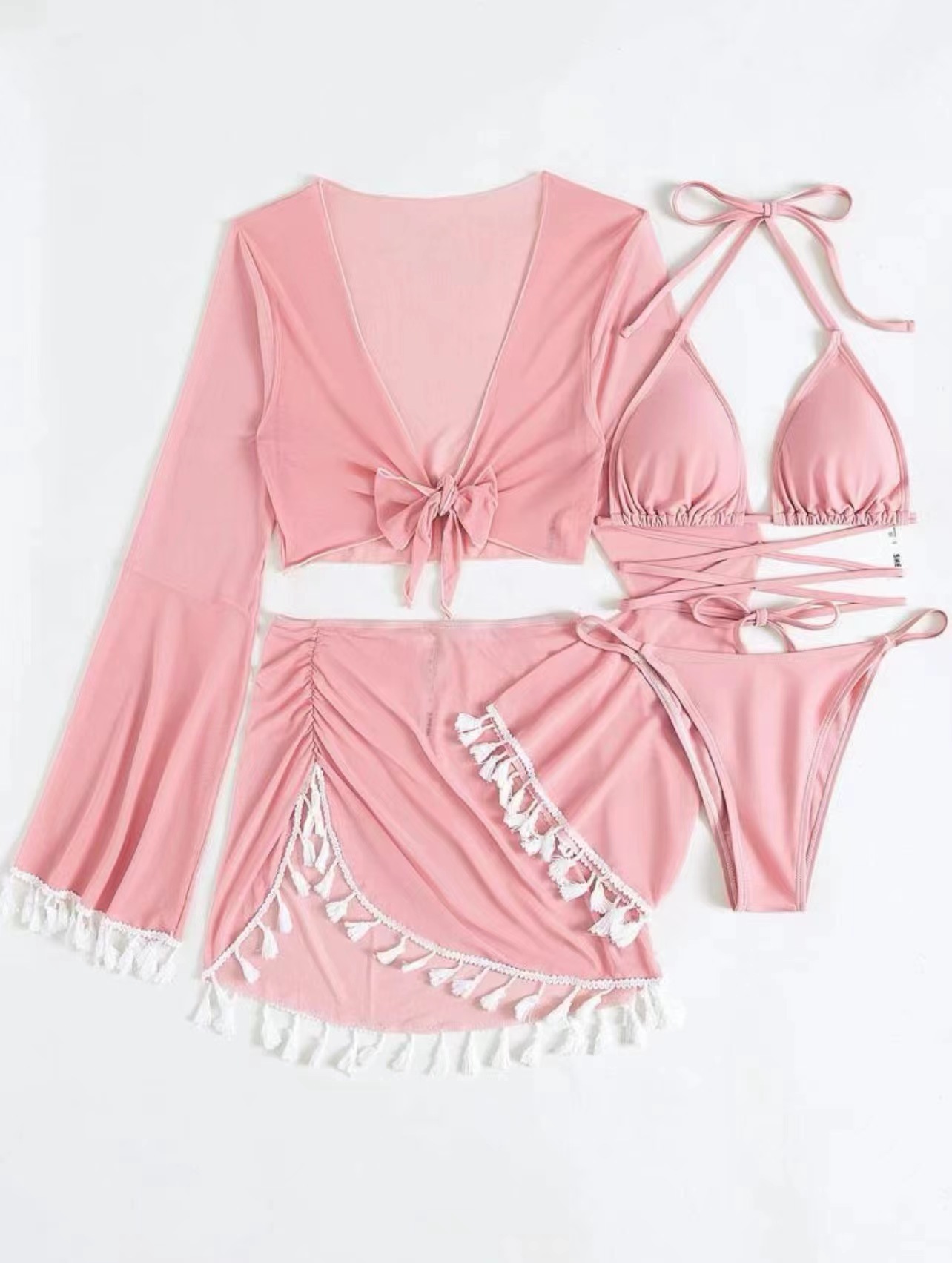 This new women swimsuit is made of high quality material and is designed with pure color tassel net yarn shawl dress. It is perfect for swimming and other water sports. The four-piece bikini swimsuit is suitable for women of all ages. It is comfortable and fashionable. It is a must-have item for your summer wardrobe.